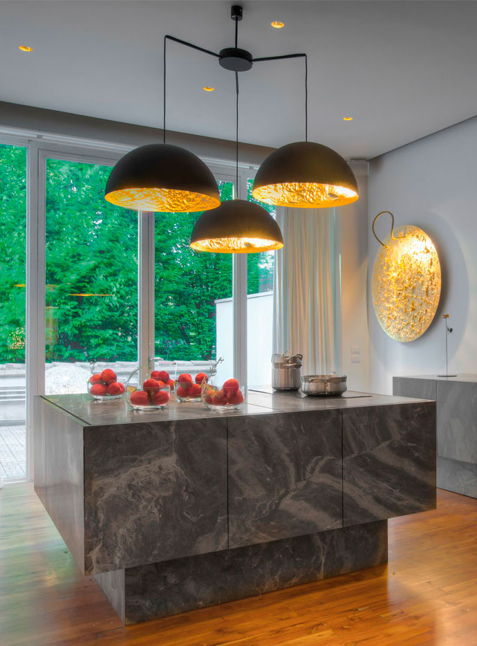 structure en métal ; demi-sphère en aluminium avec surface interne irrégulière revêtue en feuille couleur or